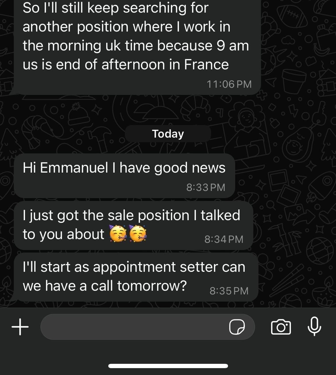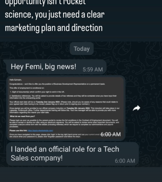 Went from Looking for his first role to having $3k close deals, and flown out by the business owner
